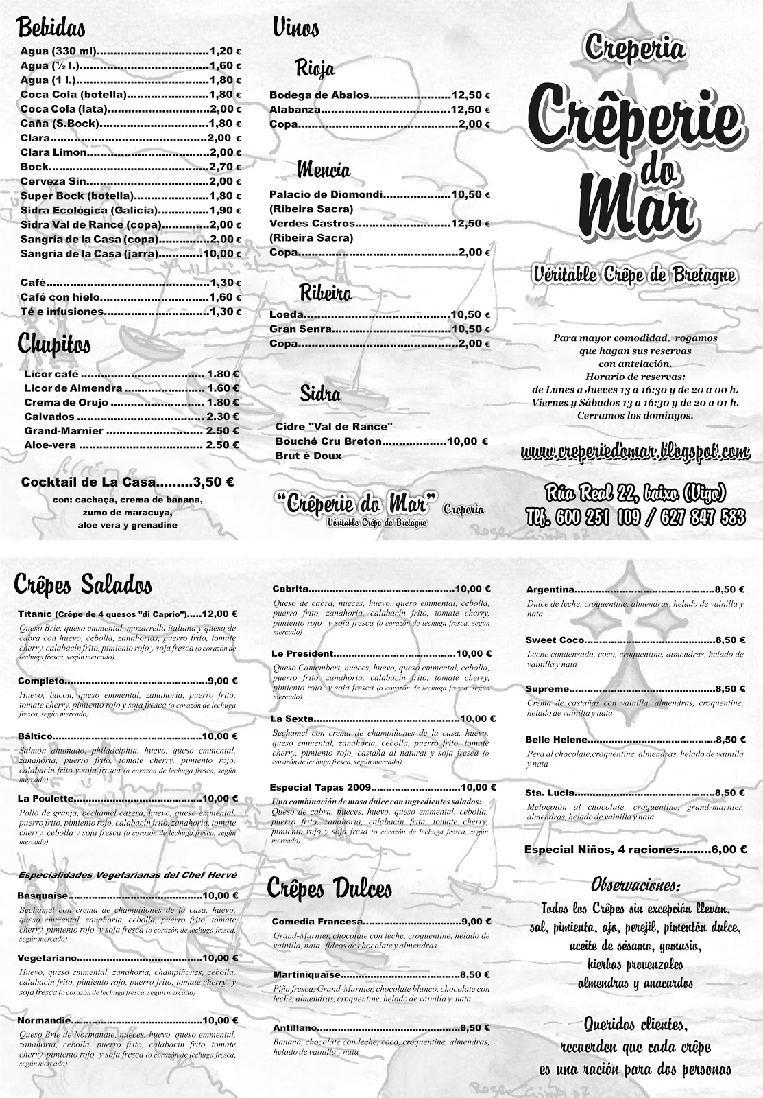E segundo o dono da Creperie do Mar, Hervé Valette, o éxito (que é bastante) da Crêperie do Mar se debe, simplemente, a esa receita bretona. “Se tes a formación en Bretaña, é moi fácil facer crepes que triunfen. É todo mérito da gastronomía da rexión”.  O menú bretón pode completarse con bebidas tamén típicas, como a sidra (doce ou amarga) e o chuchen, un licor celta feito a partir da mel. E aínda que non é típico bretón, tamén hai chupito de aloe vera!