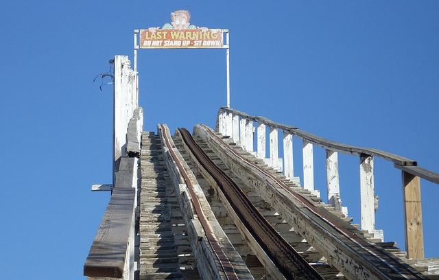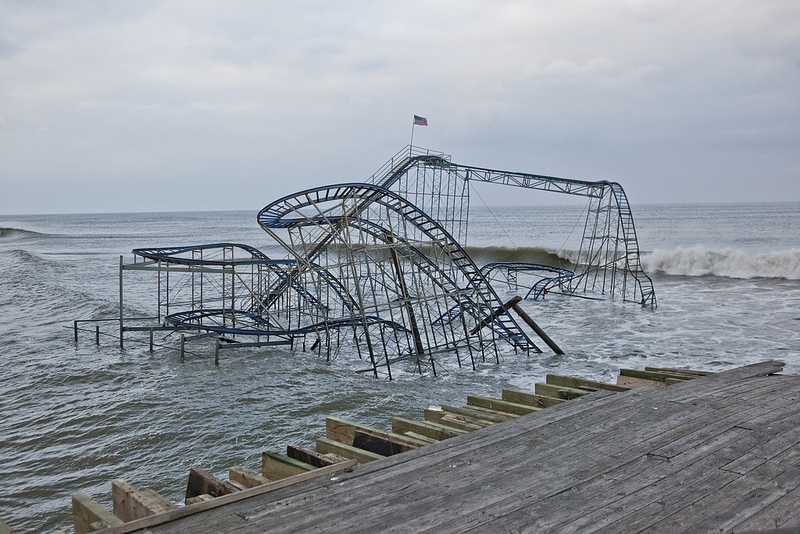 - Casino Pier, Nova Jersey, Estados Unidos (1969-2012). Este parque de atraccións situado no porto de Seaside Heights foi destruído en 2012 polo furacán Sandy, dando como resultado esta curiosa imaxe dunha montaña rusa no medio do mar.