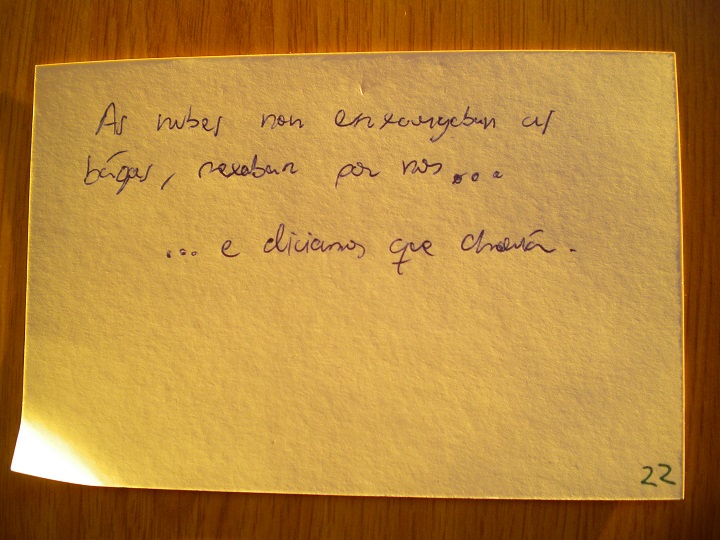 Xa pasou unha semana desde o Culturgal, pero non esquecemos o prometido. E é que se vos pasastes por alí, tivestes a oportunidade de participar nunha literaria actividade que organizabamos xunto con Librópatas: o cadáver exquisito. Hoxe veremos o resultado obtido.