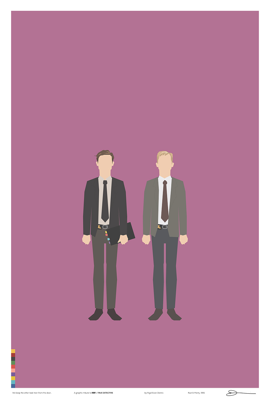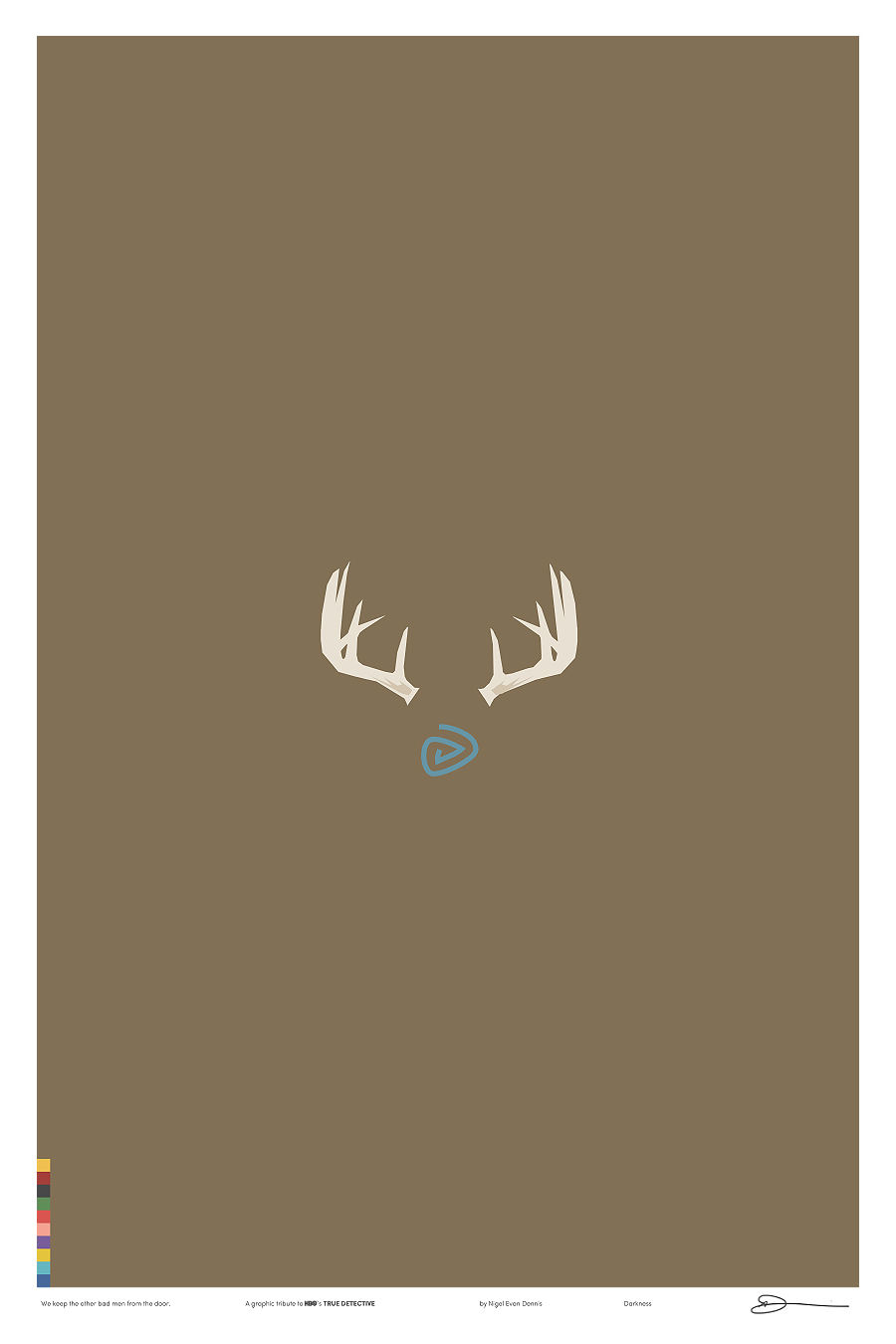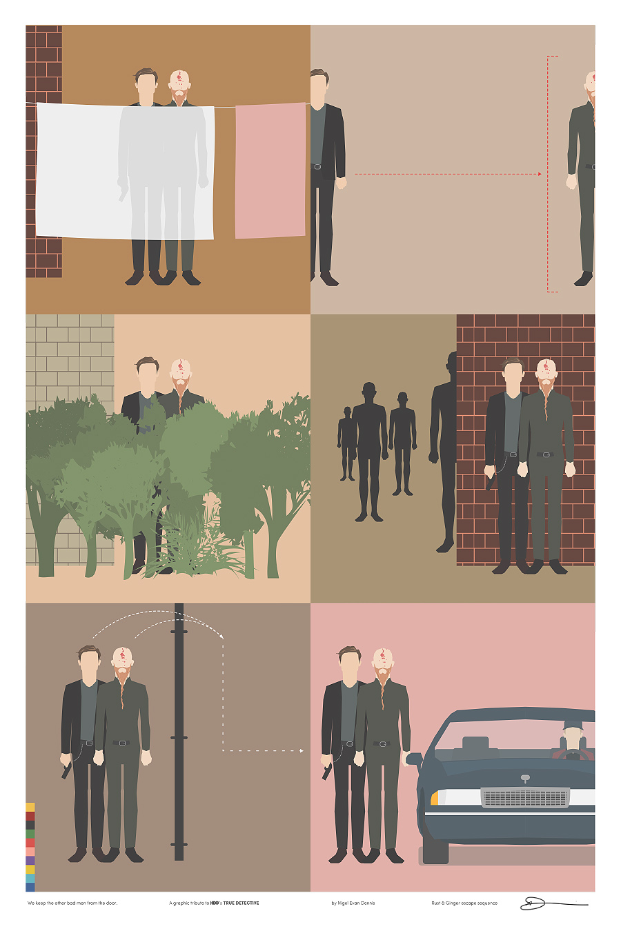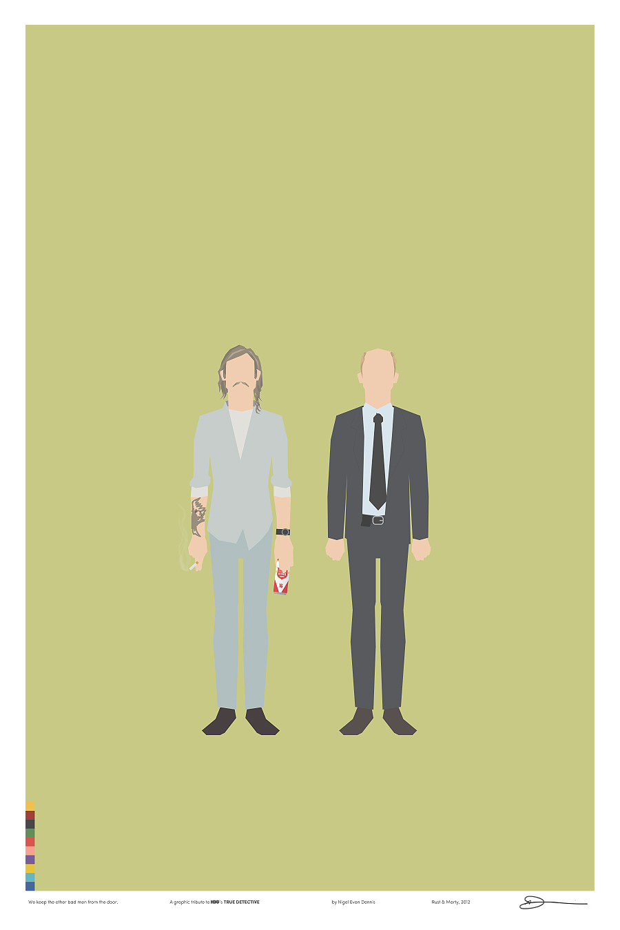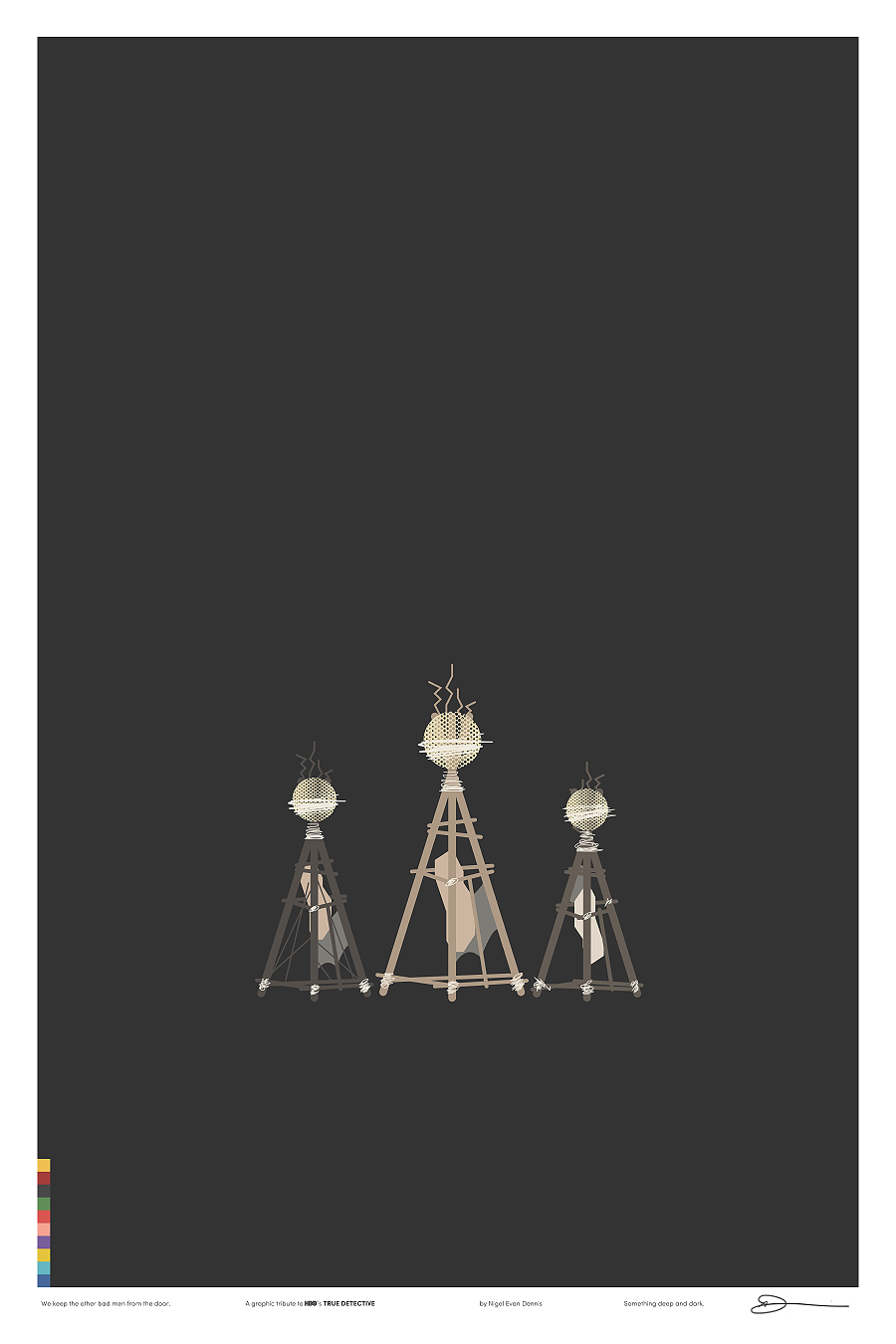 Iso é o que fixo o deseñador e ilustrador Nigel Evan Dennis cando, tras ver o episodio 4 non aguantou máis e empezou a crear unha serie de ilustracións minimalistas sobre os símbolos e personaxes da serie, analizando relacións e quen ten máis papeletas para ser o Yellow King (agora xa o sabemos, ou polo menos iso nos fixeron crer no episodio 7). E xa postos a facer ilustracións sobre unha serie que ten tolo a medio Internet… por que non vender as láminas?. Deixámosvos aquí as 12 ilustracións sobre ‘True Detective’ de Nigel Evan Dennis. Pero non vos perdades a súa web, www.wekeeptheotherbadmenfromthedoor.com (si). Parécenos unha homenaxe ao nivel axeitado.