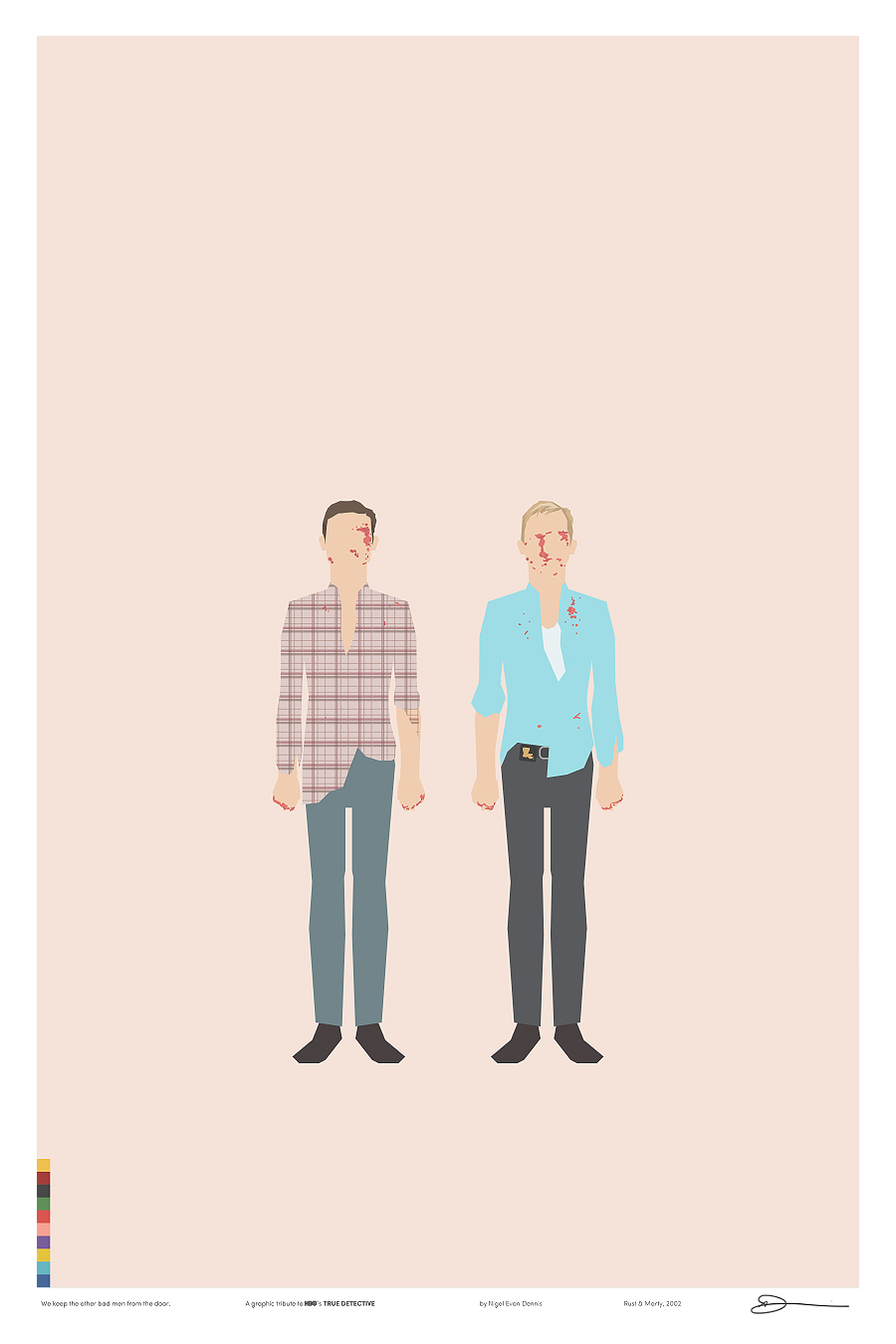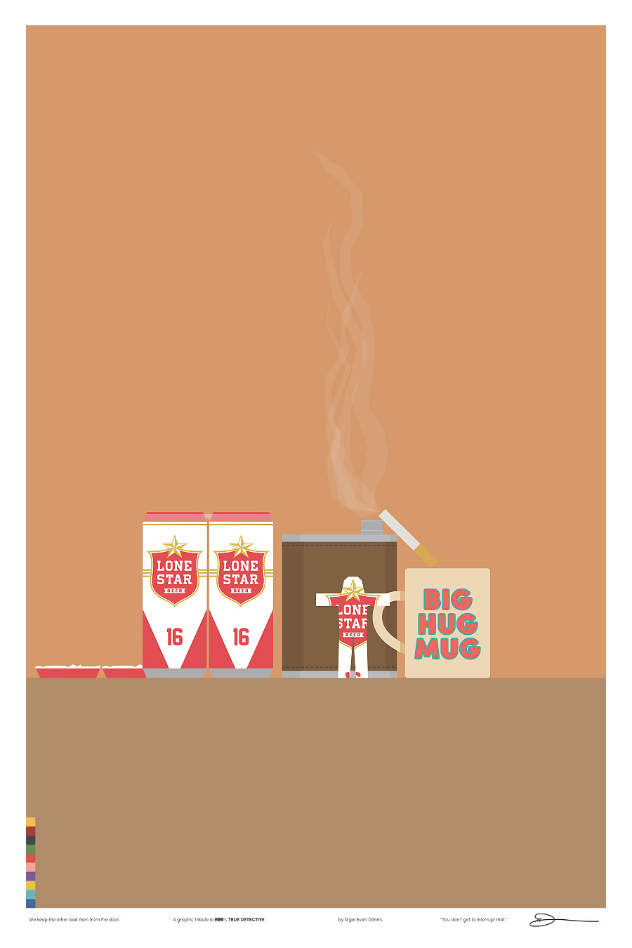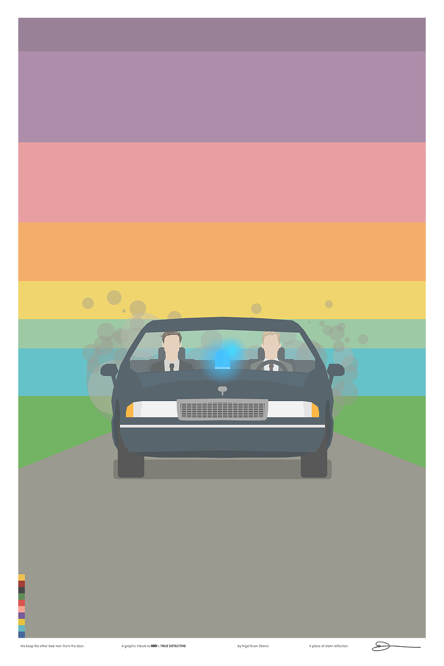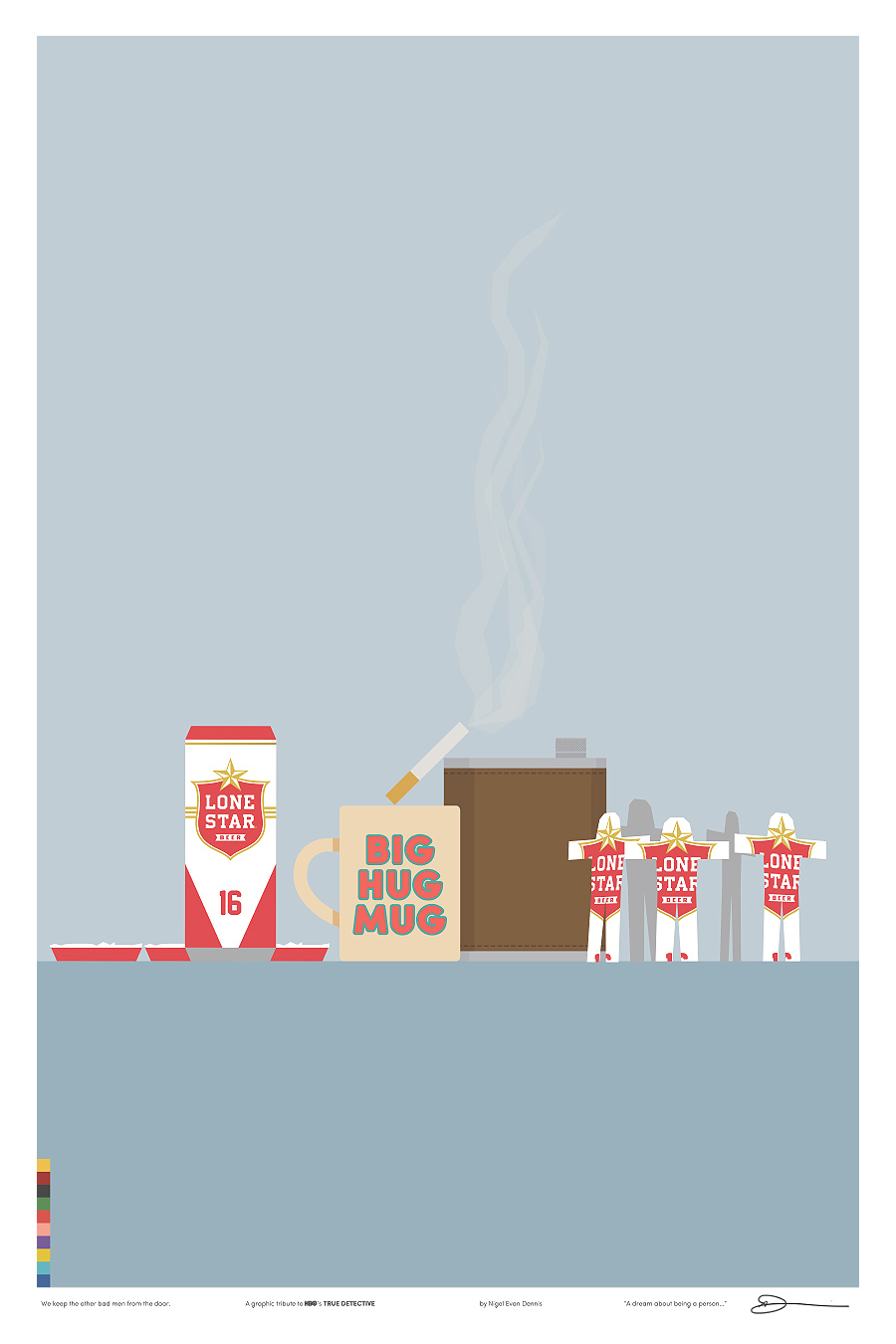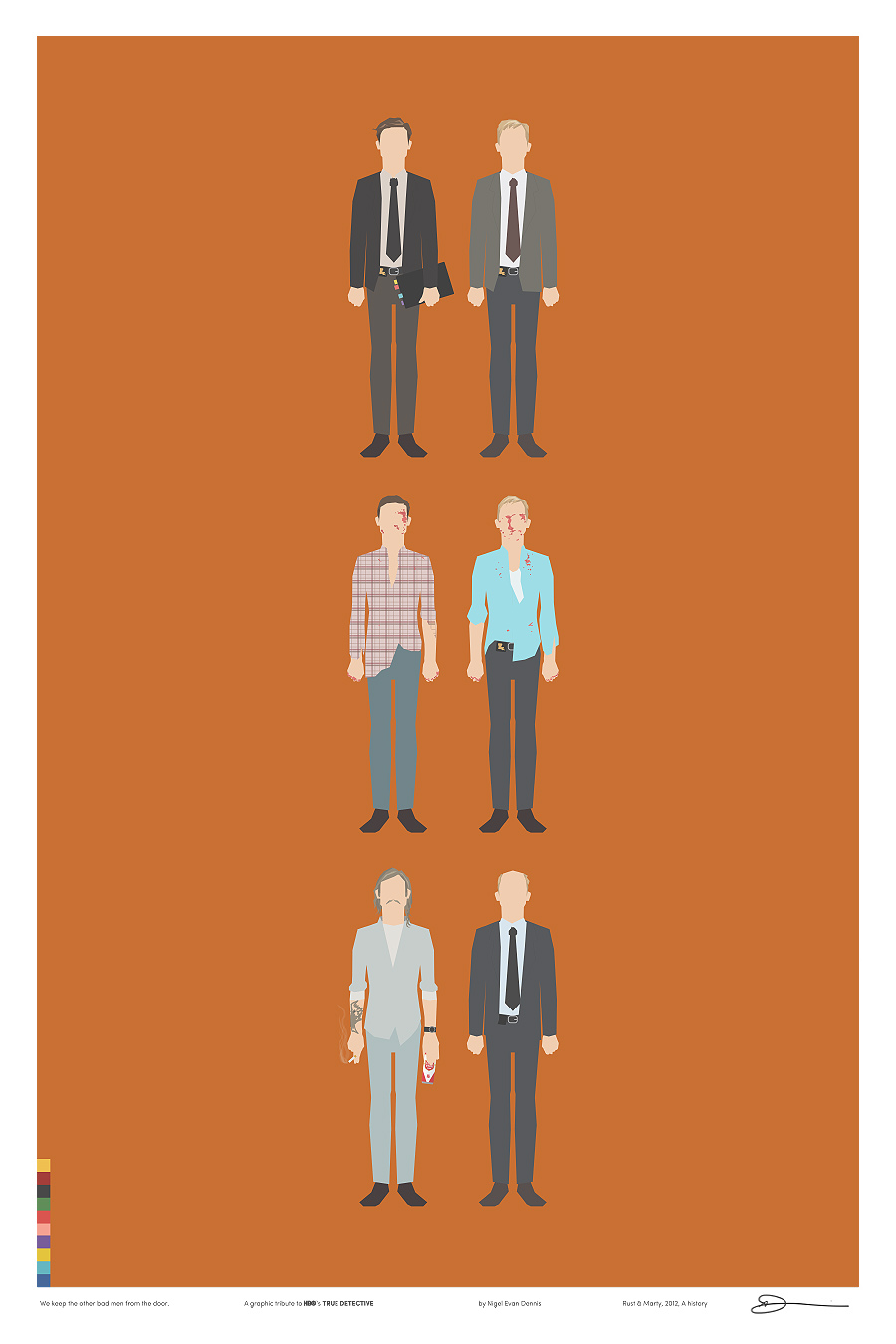 Iso é o que fixo o deseñador e ilustrador Nigel Evan Dennis cando, tras ver o episodio 4 non aguantou máis e empezou a crear unha serie de ilustracións minimalistas sobre os símbolos e personaxes da serie, analizando relacións e quen ten máis papeletas para ser o Yellow King (agora xa o sabemos, ou polo menos iso nos fixeron crer no episodio 7). E xa postos a facer ilustracións sobre unha serie que ten tolo a medio Internet… por que non vender as láminas?. Deixámosvos aquí as 12 ilustracións sobre ‘True Detective’ de Nigel Evan Dennis. Pero non vos perdades a súa web, www.wekeeptheotherbadmenfromthedoor.com (si). Parécenos unha homenaxe ao nivel axeitado.