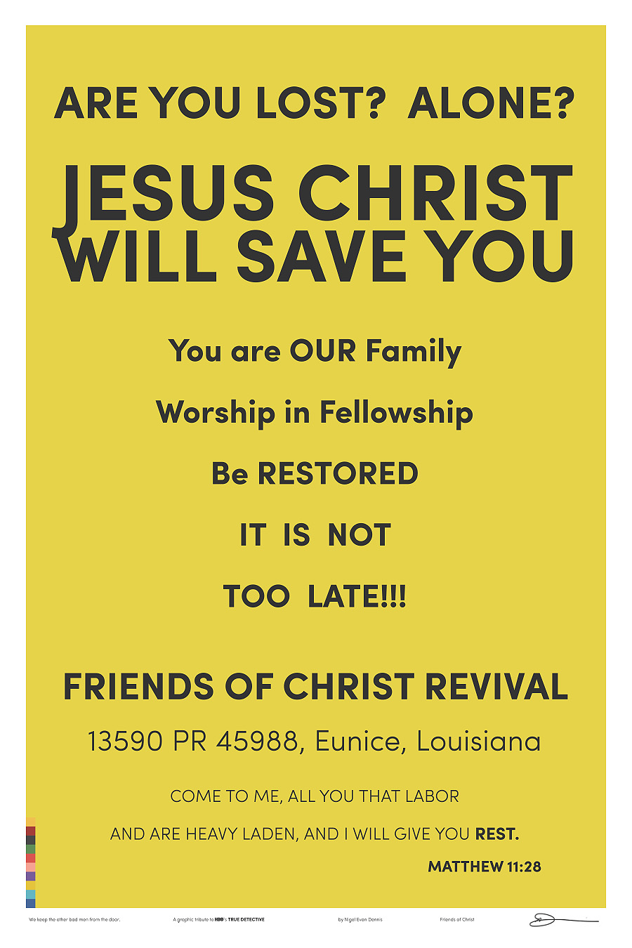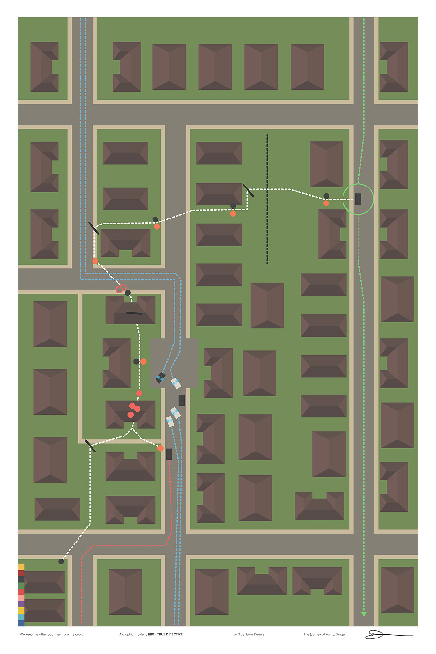 Se seguides ‘True Detective’ (non vou a insistir no que vos estades a perder se non o facedes, é cousa vosa) seguro que estades a contar os días ata o vindeiro luns, cando no voso programa de torrents favorito aparecerá o oitavo e último episodio. Quizais esteades a pasar a semana intentando non pensar no tema ou quizais esteades a profundizar na obsesión vendo todos os episodios de novo para coller todas esas pistas que agora sabes que si eran importantes. Ou, se sodes deseñadores, é posible que teñades pasado os últimos días creando ilustracións baseadas na serie de HBO. E, de paso, intentando darlle a todo algo máis de sentido.